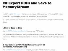 Ключевые слова: pdf export c#, c# pdf export, export pdf c#, c# export pdf, export to pdf c#, c# export to pdf, export to pdf in c#, asp net export html to pdf IronPDF can export and save pdf's using different methods. There are two ways that you can export a PDF in a .Net ASP.net project using IronPDF. You can use the IronPDF, HTML to PDF renderer to create a PDF from any existing web page, HTML file or HTML fragment, including image, JavaScript and CSS assets. You may also be within an ASP. Net webforms project, use the ASPX to PDF functionality to render that ASPX page as a PDF instead of HTML, a great time saving convenient for web forms developers. Iron PDF allows you to open an existing PDF and export the content from that including the text content and the images. You can also edit it inserting new pages which you can take from a media you've created or from an existing PDF and insert them. You can also render new content with intro PDF on top or behind the existing content. For example, watermarks, background, page numbers, headings or footers. You can save any IronPDF.PDF document object to a memory stream by using the PDF document.stream property. You may also be interested in the binary data property of the PDF document which exports the data as a byte array. By adding a user and author password to the metadata of your PDF, you may encrypt it using 218 bit or higher encryption protecting the PDF document. You may also protect the PDF document from copy and paste if you choose. You can use IronPDF to export PDFs in C# using any type of .Net project whether it is Windows Forms, console, MVC, an Azure function, whatever you like. Class Library projects are fully supported by IronPDF for C# PDF export functionality.