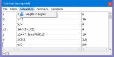 Ключевые слова: calculator, complex numbers, variable Calculator for simple and complex multi-step calculations using numbers, constants and complex numbers; like in MathCad, only for free; full compatibility with "generally accepted" writing formulas in one line without using special graphics (taking into account the priority of operations); synchronous calculation and error control when entering a mathematical expression; Saving calculation to a text file and loading from a text file; support for basic math operators, math and trigonometric functions; support for an arbitrary number with Latin, Greek and Cyrillic names; support for custom constants.