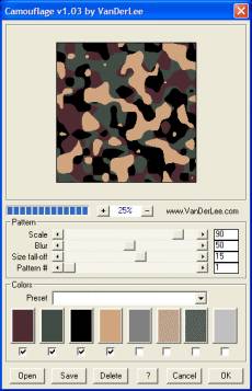 Ключевые слова: camo, camouflage, camoflage, camoflauge, camoflouge, cameo, patter, nature, army, desert, snow, marine, navy, ground, force, forces, air, sky, hornet, stinger, wood, forrest, forest, dessert, spot, spots, smudge, smear, paint, scale, size, vanderlee, vdl, vanderlee Camouflage is a freeware plug-in for PhotoShop compatible plug-in hosts. It will work with applications such as Adobe PhotoShop, JASC Paint Shop Pro, Corel PhotoPaint, ULead PhotoImpact and MicroGrafx Picture Publisher amongst many others. With Camouflage you can easily create any type of camouflage texture you desire, ranging from authentic WW2 army vehicle camouflage patterns to modern-day NATO patterns to animal textures of various types. You have full control over the look and feel of the effect; scale, blurring (the smoothness of the spots), falloff (how much area each color layer should cover), up to 8 different color layers and a random feature, allowing for 10,000 different patterns. All textures generated by the Camouflage plug-in are seamless and can be wrapped for use in web background use or 3D graphics and since the pattern is automatically scaled to the image size, you can even use it to easily create mipmaps for use in real-time 3D applications. There also a large list of common, authentic (WW2, NATO) and animal color presets, based on actual patterns. This plug-in is free to download, so you have no excuse to not try it yourself!