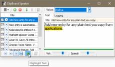 Ключевые слова: Clipboard, Text-To-Speech Speak text copied to the Clipboard from applications. Features: Add new entry for any plain text you copy from applications. New entry is automatically synthesized / spoken, even when a new entry added. Keep playing entries in listing when Continuous Play is enabled. Highlight spoken words while text is spoken, when option is enabled. Clear All, Save All entries to file via Export, and Import file (append) to add it back. Change Voice Name, Voice Rate (speed), and Voice Volume. Advanced feature: Add SSML Markup to alter the Voice for certain text in an entry. Save All entries to: a Single plain text file, a Single Audio (wav/mp3 for now) file. Use Global Keyboard Shortcuts to Play, Stop, Dis/Enable Clipboard Monitoring, etc Split Paragraphs option auto splits a long article into new entries. Some features are Limited in free.