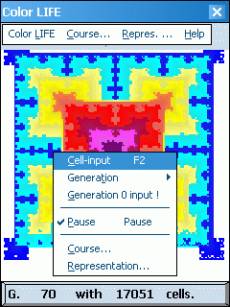 Ключевые слова: games, color, life, graphic, microorganism, palette, animation, windows ce, pocket pc, mobile, software Color LIFE illustrates the reproduction behavior of microorganisms. The reproduction rules can be independently selected likewise the incremental width and output time of the generations. Color-palettes can be produced on your own. With a shape-run, new rules and nice graphics can be found. The generations become also represented with decimal cell-diameters smaller than one and with a median color value. For Windows CE is offered Color LIFE for different processors, that were not tested all by us. Please test Color LIFE with our test-version on your CE-device therefore beforehand.