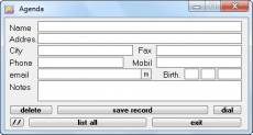 Ключевые слова: Agenda, Address, Phone, Dial, Languages My personal Agenda - This is an address and phone agenda, with phone list, birthday listing, search all, automatic phone dialing and several options. This is the one I use and always have used for my own addresses and phone book. It was first created in Aurora basic (anyone remember?) many years ago, and then re-made in C and some years later in Delphi. Has basic suport for 3 languages, and if you would like to have any diferent one included, please email me with the translation for all the menus and button captions, and I will be glad to update it.The (about) button is a component for Delphi created by myself as I could not find a realy simple one for this - IE like -. If anyone wants a copy, please fell free to email me.