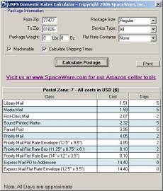 Ключевые слова: USPS, Postage, Postal, Rates, Free, Domestic, International, Delivery Confirmation, DC, Tracking, Calculator SpaceWare.com's USPS tools consist of three invaluable tools to manage your packages shipped via USPS. Using the Rates calculators, you can quickly determine the least expensive or fastest shipping method. The tracking and confirm tool allows you to quickly determine the status of your package with Delivery Confirmation. Domestic Rates Calculator This tool will calculate the current postal rates between two zip codes. You will need to provide the two zip codes and the weight. All available shipping options for that weight with the associated costs will be displayed. Additionally, the tool will also display the approximate time to deliver the item. All data is obtained directly from the USPS so that the tool always has the current rates. This tool will allow you to determine the least expensive rate for a package. International Rates Calculator This tool calculates the cost of shipping a package internationally based on weight. The available shipping options for the weight specified are displayed as well as the approximate time to deliver the item. Additionally, the restrictions on shipping to that country are displayed. All data is obtained directly from the USPS so that the tool always has the current rates. This tool will allow you to determine the least expensive rate for a package. Track and Confirm This tool allows you to enter a Delivery Confirmation number and display the status. If the item has been delivered, the date of delivery is shown. All data is acquired directly from the USPS web site, which means that the product will also have the current rates. SpaceWare.com is a leading provider of Amazon.com (US & UK) seller software for 3rd party sellers on the Marketplace site. Details for these products may be obtained from our website.