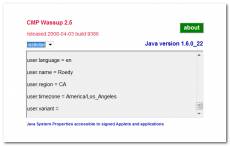 Ключевые слова: Java, images, Applet, HTML, wassup, java, properties, environment, Applets, Java Web Start, JVM, JRE, JDK Wassup let's you know what's up with your Java environment. It will tell you the System Properties, as many as the Security system will let you peek at. This includes such things as which JVM is running, which version of Java, which vendor. It may be run as either an Applet or an application. When you run Wassup as an application it shows you considerably more information. The Java sandbox considers it a security risk to reveal that information to an Applet. As an application, you can see all the possible System Properties. When you run as an unsigned Applet, your view is much more limited. If you OK the Java sandbox security override, it will let you view the restricted properties.