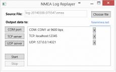 Ключевые слова: GPS, GLONASS, NMEA, protocol, replay, playback NMEA Log Replayer is free application usable for testing all kinds of NMEA applications (GPS, GLONASS, instrumentation, etc). Can playback pre-recorded GPS files with NMEA output. It can send NMEA to multiple destinations at the same time. For example, you can send NMEA sentences to remote host and write the same NMEA log to COM port on your computer. It can output NMEA to: Network host over UDP, Network host over TCP,COM Port (RS232). How to use it Actually, it is easy as 1, 2, 3: 1) Click 'Choose file' and select NMEA log file for playback; 2) Select output destinations by clicking 'COM port', 'TCP server' or 'UDP server'; 3) Click 'Start'. If you are going to send NMEA to remote host, please make sure, that something is waiting for connection on that remote host (in case of TCP. In case of UDP you can launch remote software at any time, since UDP protocol is connectionless). If some error happens on some output then you will see exclamation mark near 'X' button.